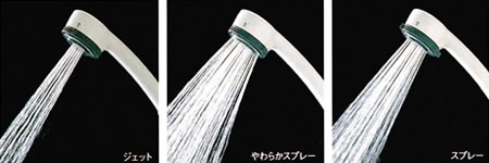 通常のスプレーモードのほか、勢いの強いジェット広がりのあるやわらかスプレーと、3つのモードが切り替えられるシャワーです。